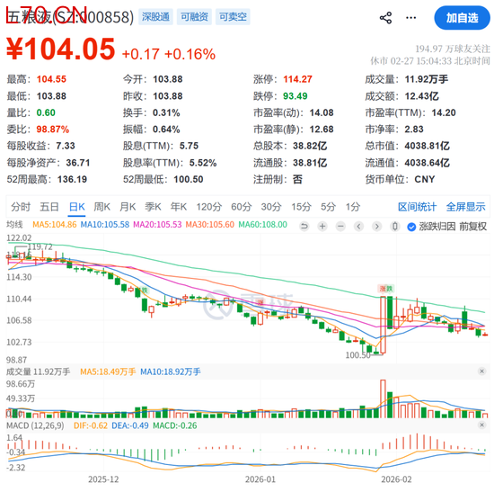 元股证券:ygzq.hk截至2月27日收盘,五粮液报104.05元/股,总市值为4038.81亿元。