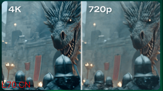 通过一段高速动态测试视频可以发现,可灵AI原生4K能力输出的视频清晰度显著提升、画面细节更丰富。即便在高速运动和复杂光影环境下,巨龙的鳞片和皮肤质感依旧细腻,甚至远处建筑的纹理细节同样清晰可辨,全面达到院线级画质水准。