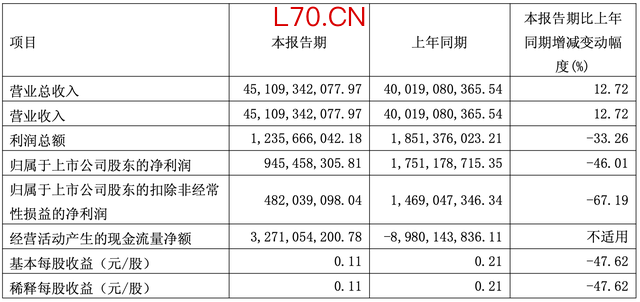 4月24日,长城汽车股份有限公司(长城汽车,601633)公告,2026年一季度实现营业总收入451.09亿元,同比增长12.72%;归母净利润为9.45亿元,同比下降46.01%;扣非净利润4.82亿元,同比下降67.19%;基本每股收益0.11元,同比下降47.62%。