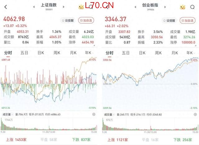 至收盘,上证综指涨0.32%,报4062.98点;科创50指数涨1.36%,报1372.58点;深证成指涨1.05%,报14187.8点;创业板指涨2.02%,报3346.37点。