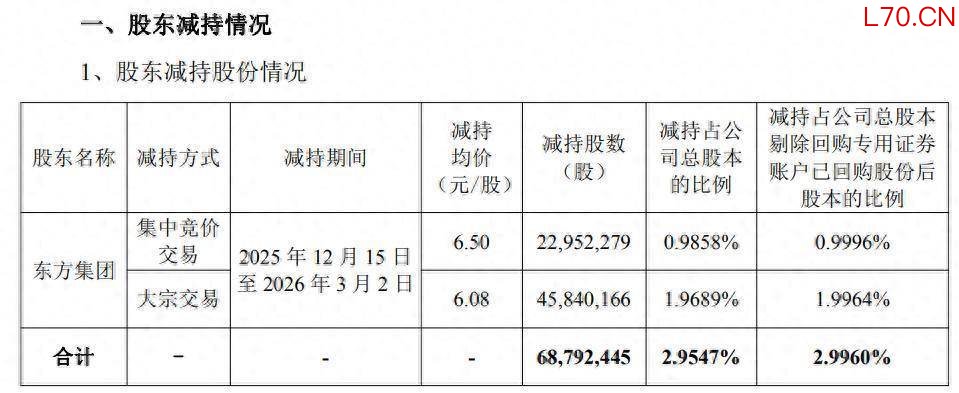 公告显示,2026年3月3日,公司收到东方集团出具的《关于股份减持计划实施进展暨提前终止的告知函》,自2025年12月15日至2026年3月2日期间,东方集团已累计减持68,792,445股,其决定提前终止本次减持计划,未完成减持的股份在减持计划期间内将不再减持。