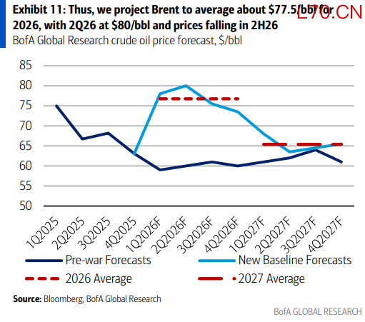 美银把情景分成四档:快速收场、冲突延续至2Q、延续至3Q、以及影响整个2H26。对应布伦特2026年均价大致落在70、85、100、130/桶,并给出最极端情景下$240/桶的峰值提示。