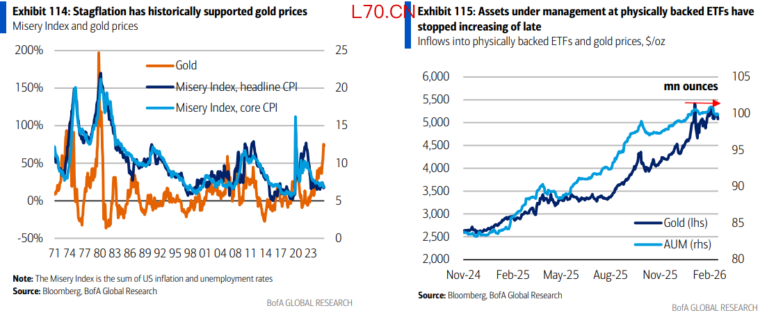 情景3和情景4(延至三季度乃至全年)才是黄金真正的看多场景:高通胀与经济停滞并存,美联储最终被迫在通胀峰值前就开始降息。历史上苦难指数(失业率+CPI)与黄金高度相关,在这些情景下美银预测黄金将突破6000至6500美元/盎司。