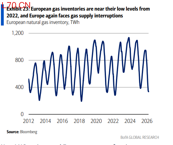 霍尔木兹封锁影响了全球约20%的LNG供应,卡塔尔和阿联酋的LNG已几乎全停。欧洲的处境比2022年更为脆弱:当时面对俄罗斯管道气是缓慢下降,有时间应对;这次是突然停供。欧洲天然气库存水平目前接近2022年的低点。