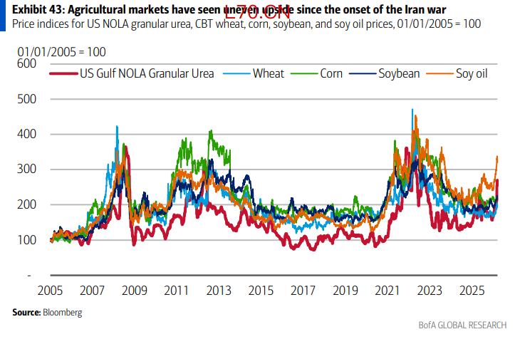 美银将2026年全年主要农产品预测全部上调:小麦从5.3美元/蒲式耳调至6.5美元,玉米从4.4美元调至5.3美元,大豆从10.4美元调至11.9美元,大豆油从49美分/磅调至65美分。若战事延至三季度,玉米价格可能逼近7美元,小麦8美元。