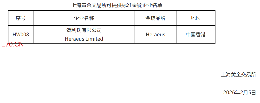 上海黄金交易所:新增贺利氏有限公司为境外可提供标准金锭企业