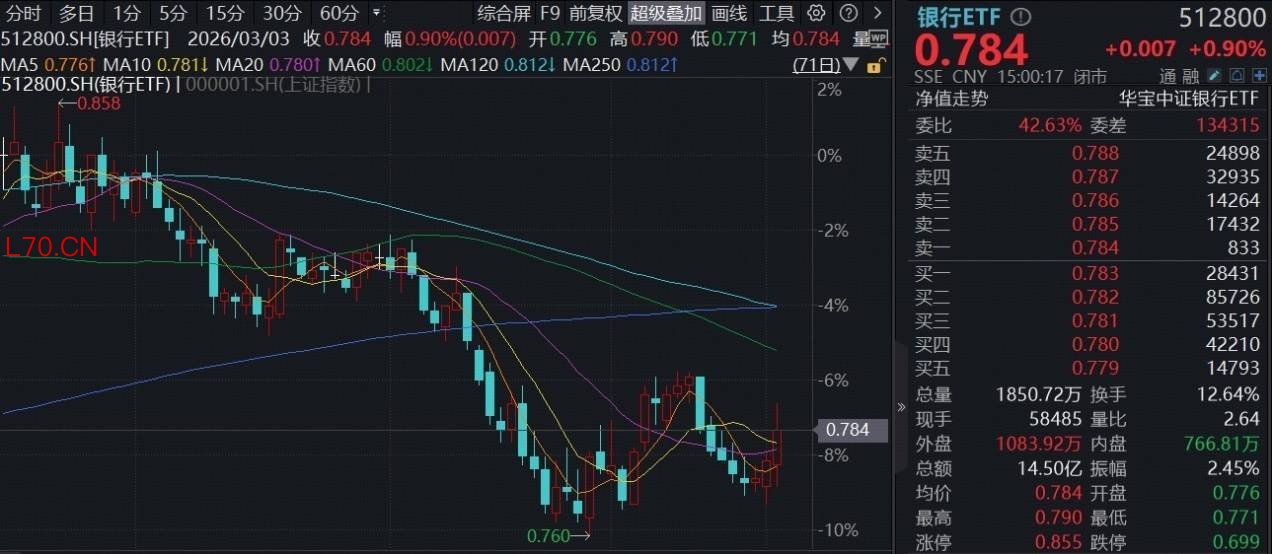 地缘冲突加剧导致全球避险情绪升温,银行股逆市走强。全市场规模最大的银行ETF(512800)场内价格一度上涨1.67%,收涨0.9%,日线稳步3连阳,收复10日、20日两条重要均线,全天成交额14.5亿元,创2025年12月以来天量。