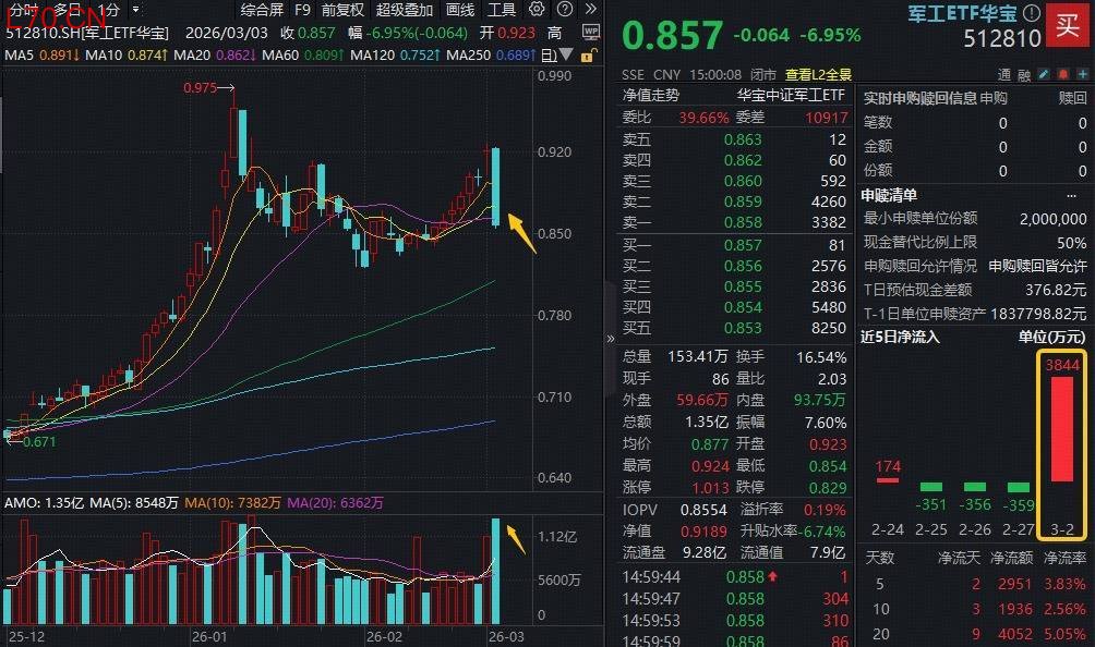 三、突遭“情绪杀”?军工ETF华宝(512810)单日急跌近7%创纪录!地缘逻辑还在吗?低吸资金悄然布局大市走低,A股超4800股收跌,市场风险偏好急速下降,成长属性突出的军工板块掉头向下,领跌全行业!