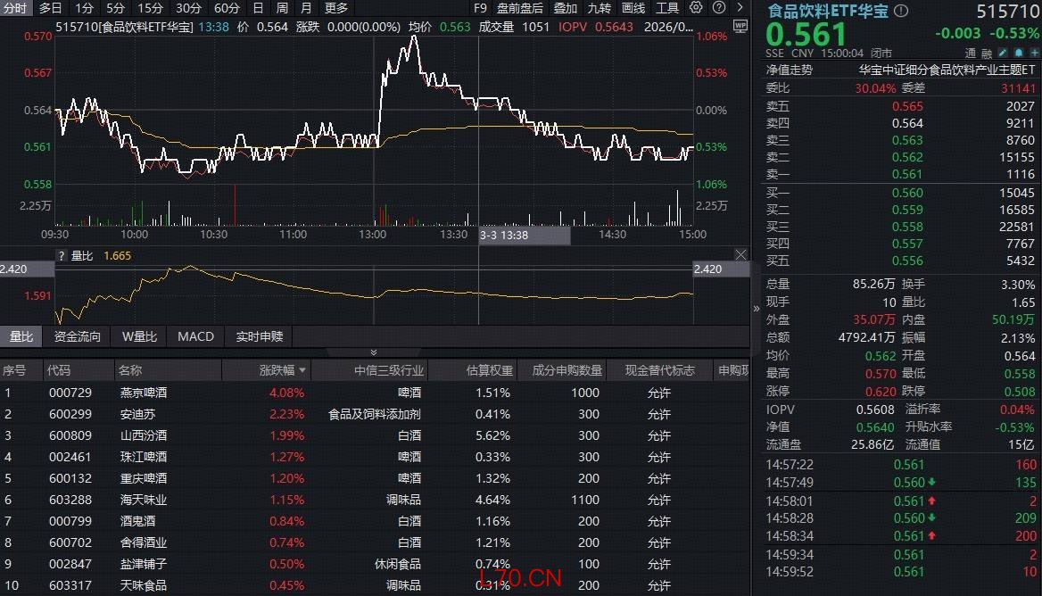 二、吃喝板块韧性十足,食品饮料ETF华宝(515710)一度逆市涨超1%!机构:白酒板块底部价值凸显